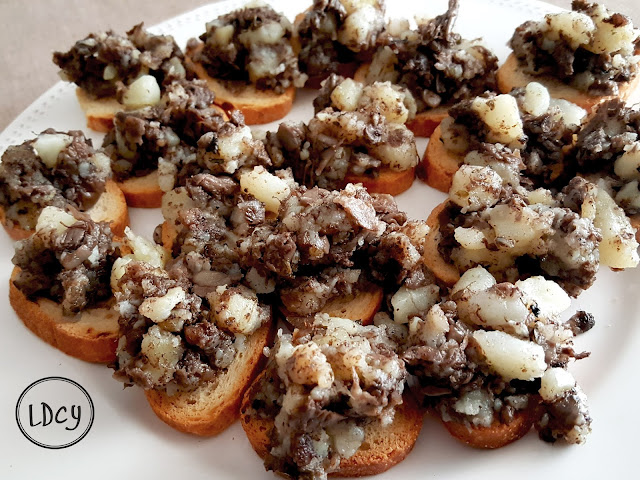 sobre las tostaditas una cucharadita del revuelto de patata y morcilla que